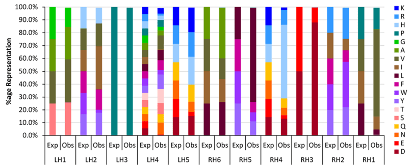 Poole AJ, et al.. A C-terminal cysteine residue is required for peptide-based inhibition of the NGF/TrkA interaction at nM concentrations: implications for peptide-based analgesics. Scientific Reports 2019; Jan 30; 9(1):930. The diagram depicts the design of a peptide library prepared for maturation of an anti-NGF peptide for the treatment of pain. The design at each amino acid position (LH1-RH1) is compared to the prepared library, Exp and Obs, respectively. This was a collaboration between Aston University and Isogenica Ltd.